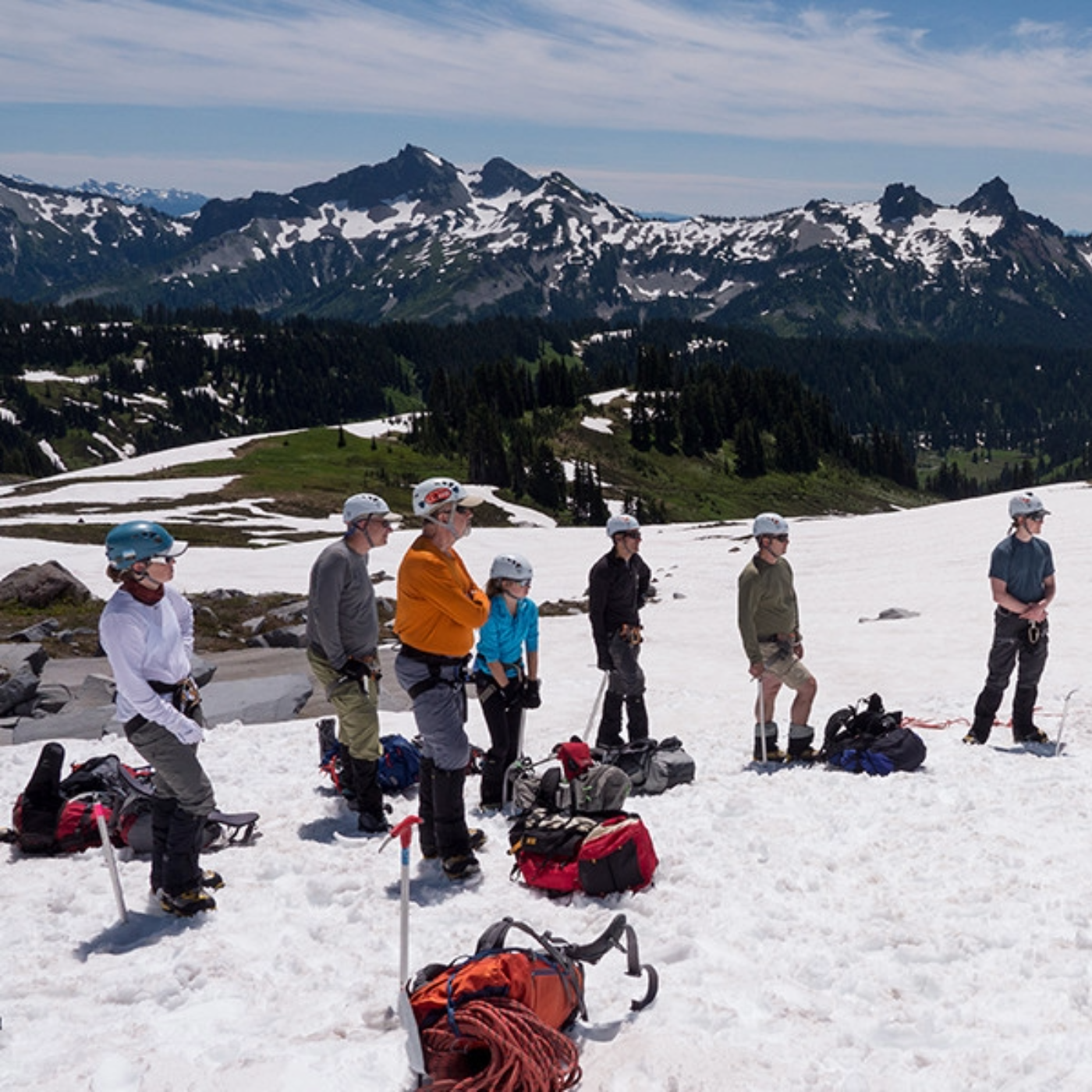 RMI’s Mountaineering Day School is the perfect first step for aspiring climbers. Led by professional guides on Mount Rainier’s lower glaciers, this one-day course teaches essential movement and safety skills — the same techniques used on Rainier, Denali, and beyond.