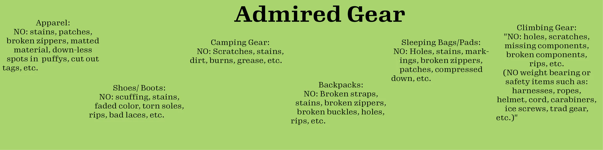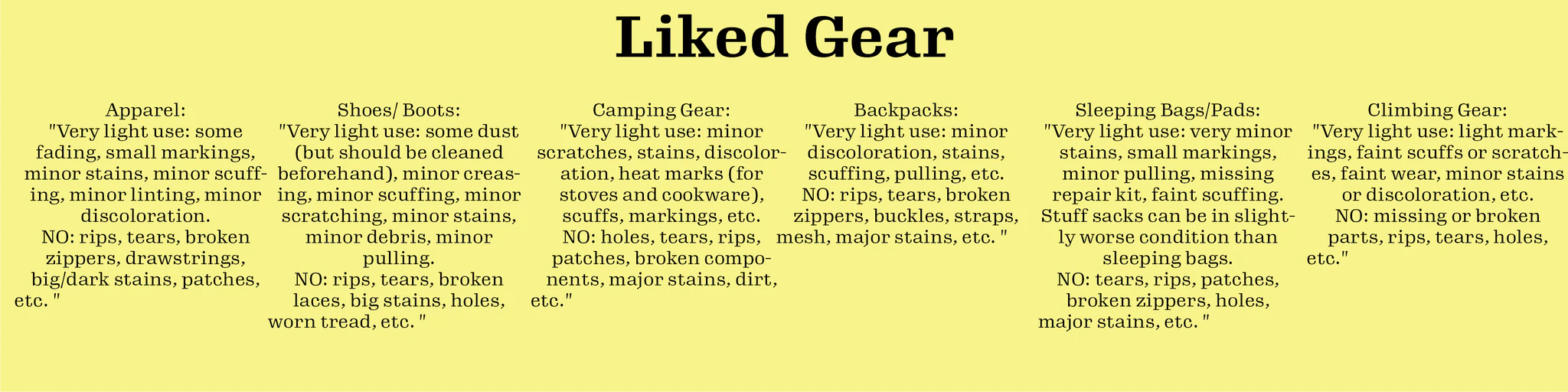 Because the gear we carry is so dang solid, it can go through quite a bit of cosmetic abuse before it stops performing like it should. We will make sure the gear you buy from usmeets your expectationsandfunctions as designed, regardless of whether it's new or used. That's why we've come up with a 4 tier rating system for our used gear; Admired, Liked, Loved, and Adored.